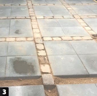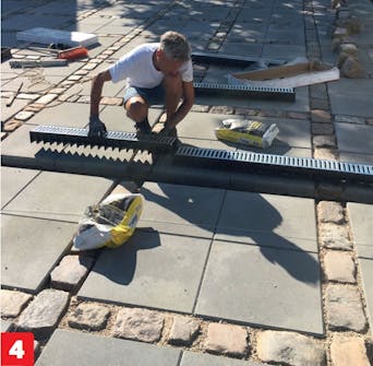 Dreneringsrennen plasseres i rennene mellom “øyene” av betongheller. Rennene er tilpasset i størrelsen, slik at det akkurat er plass til dreneringsren-nene. Det må planlegges inn fra starten av, fordi det også skal være litt fall mot rennen fra begge sider av belegningen.