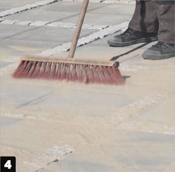 Fugesanden feies ned ved å feie diagonalt på fugene. Da er det enklere å fylle dem opp. Fyll på fugesand, og fei ned i flere omganger, etter hvert som det siver ned.