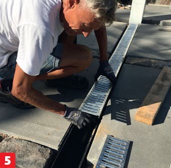 Dreneringsrennen legges på plass. Trykk den på plass i betongen, slik at toppen havner 5 mm under belegningen. Fyll deretter opp med grus i sidene.