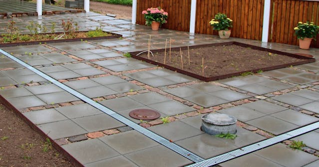 Legger du et stort område med stein som her, er det en god idé å hjelpe vannet med å bli ledet vekk. Det gjøres effektivt ved å bruke dreneringsrenner. De fanger regnvannet og leder det vekk dit du vil ha det.