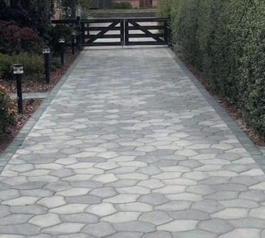 HELLER I INNKJØRSLER kan gjerne være mangekantet. Det låser hellene godt sammen til en sammenhengende flate, slik at du unngår “kjørespor” fra tunge biler - dog kun hvis underlag og kantsikring er i orden. Generelt bør mindre stein til en innkjørsel være minst 6 cm tykke, mens større heller minst bør være 7 cm tykke.