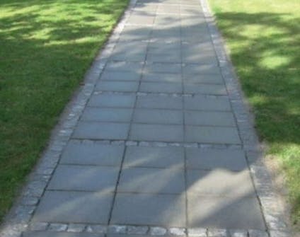 STORE HELLER OG SMÅ STEIN gir en god dynamikk i en belegning. Hvis det kun hadde blitt brukt kvadratiske betongheller til denne hagegangen, ville de fleste nok syntes at den var helt ordinær, men ved å bryte med granittstein på tvers og langs kanten, blir den plutselig mer interessant.