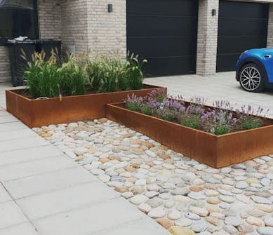 Kanter av jern fås som massive jernkanter og rustfritt stål i forskjellige høyder og tykkelser og kan bestilles på mål. Her er det brukt corten-stål, som ruster i overflaten, men ikke i dybden.