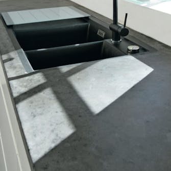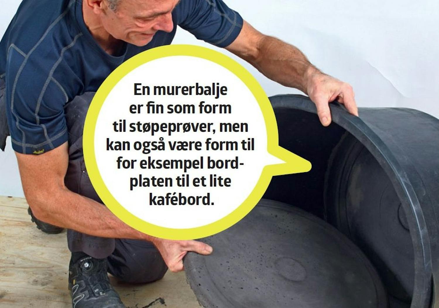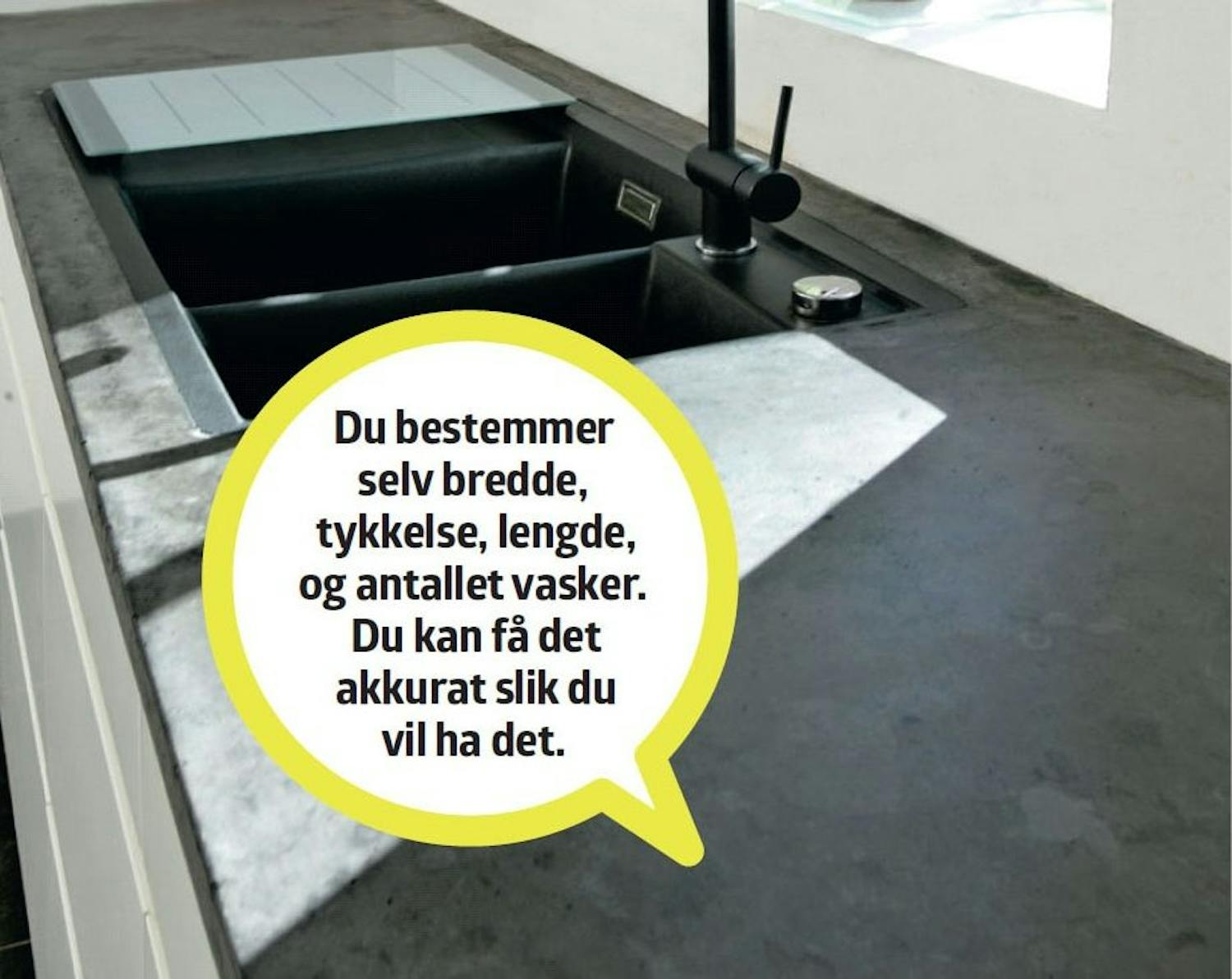 Bland i forholdet 1:2:3 (sement, sand, stein), hvis du armerer benkeplaten med jern eller armeringsnett. Hvis du armerer med fibre, skal du kutte ut steinene i betongen.FERDIGBLANDET (tørrbetong)