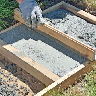Tørrbetong 0-8 mm. På større arealer bør du støpe ett stykke om gangen, så betongen ikke herder under arbeidet.