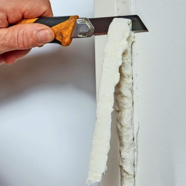 Det herdede skummet skjæres til. Sett et nytt blad i hobbykniven, og skjær det jevnt med karmen og veggen uten å skade dem.