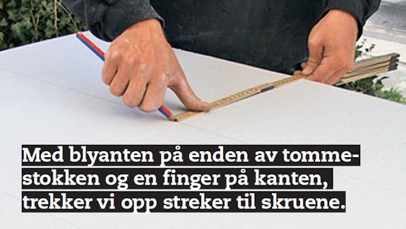 Mens du har platene på bukkene, kan du med fordel streke opp hvor skruene skal sitte. Slå streker på platen der det vil være stolper og lekter på baksiden. Da slipper du å bomme når du skrur fast skruene inne på midten av platen.