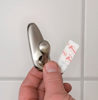 Det avhenger litt av emnet om du setter fast teipen på det først, eller på flaten det skal sitte på. Gjelder det et speil på badet eller en liten knagg det samme stedet, vil det være naturlig å utstyre emnene med teip først, mens det vil være litt vanskelig å gjøre det samme med vegg til vegg-teppet. Her skal teipen på gulvet først, én kant om gangen.
