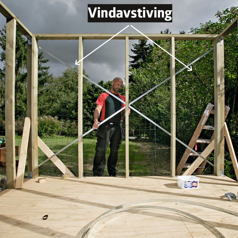 Hageboden eller lekehuset er avstivet med diagonalt fastspente hullbånd. Forankringen gjøres med hullbånd festet til henholdsvis toppsvillen og fundamentet.