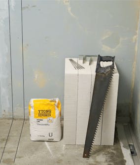 Det avgjørende for å få en vegg av porebetong til å stå i lodd, er å få satt den første raden helt rett i alle retninger.