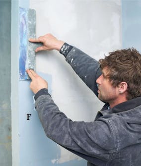 Porebetongen glattes med sparkelmasse (F). Den trekkes på og glattes med en bred sparkel. Når massen er tørr, slipes veggene og grunnes med en primer fra det systemet du har valgt å bruke.