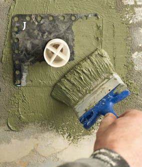 Bruk rørmansjetter (J) rundt rør som bryter veggen. Vær nøye med å trykke dem ned i den friske membranen, og deretter å påføre ytterligere membran.