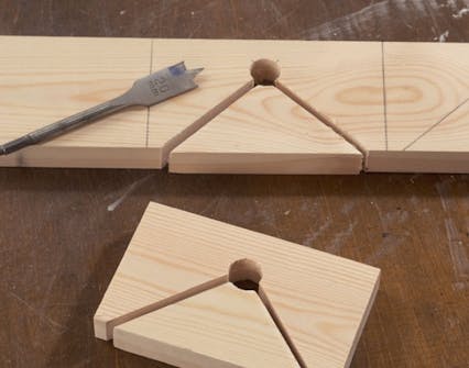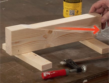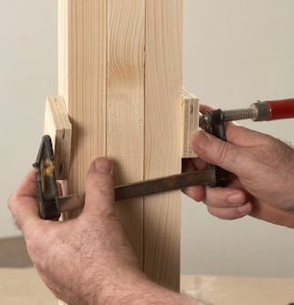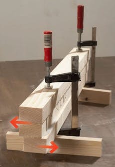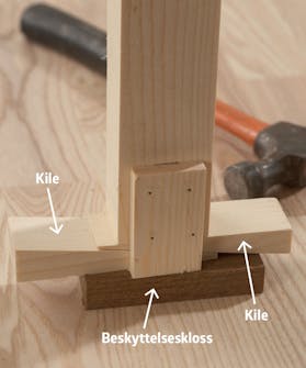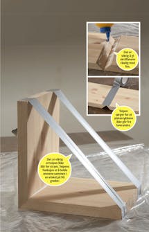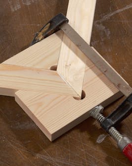 Lag små spennklosser - én med et 90 graders snitt og én som tilsvarer innsnittet. Når spennklossene er plassert riktig, spennes det etter med tvinger.
