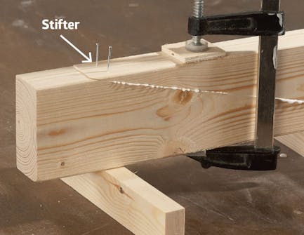 Når flere lekter skal limes sammen til for eksempel en limtrestolpe, kan du fint bruke et par ganske vanlige skrutvinger. Men faren for at materialene sklir i det våte limet når tvingene spennes er ganske stor.
