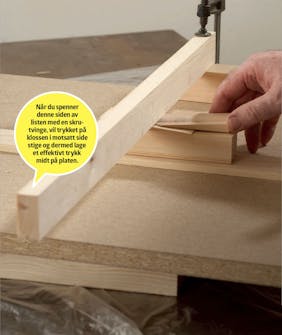 Bruk vektstangprinsippet. Fest et listestykke oppå en kloss i platestykkets ene side, og plasser en løs kloss oppå limstedet. Spenn til slutt etter med en tvinge i plate stykkets motsatte side.