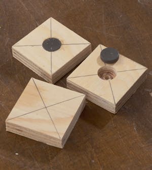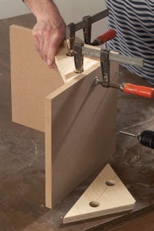 Et lite platestykke sages som en rettvinklet trekant, og utstyres med to hull. Med et par små tvinger fikserer den lille hjelpetrekanten de to platestykkene i hjørneskjøten, slik at du kan skru sammen platene i ro og mak.