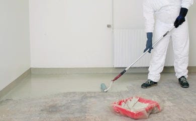 Før gulvet kan males, skal det grunnes. I dette tilfelle bruker vi en tokomponent epoksygrunning fra Sika, Sikafloor 156, som er helt fargeløs.