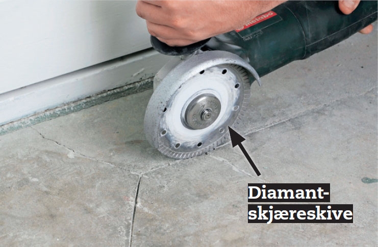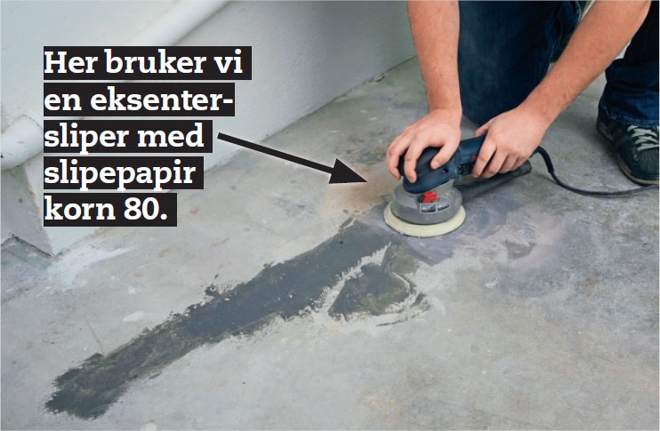 Forhøyninger på gulvet slipes ned til gulvet er helt plant. Bruk en vinkelsliper med en diamantkopp på. Skru ned hastigheten - da er det lettere å slipe.