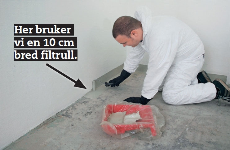 Gulvet males med en rull på et skaft. Det er en fordel å male et lite stykke opp på veggen. Den lille kanten er praktisk når gulvet skal vaskes, i tillegg gir det en pen, listlignende avslutning.