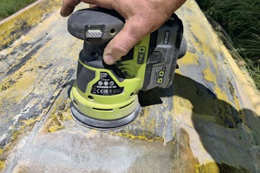 Etter et par timer er glassfiberen blitt så hard at du kan slipe i den. Vi bruker en eksentersliper med en korn 60-slipeskive. Det gir en pen, jevn overflate.