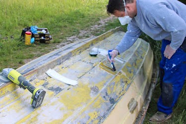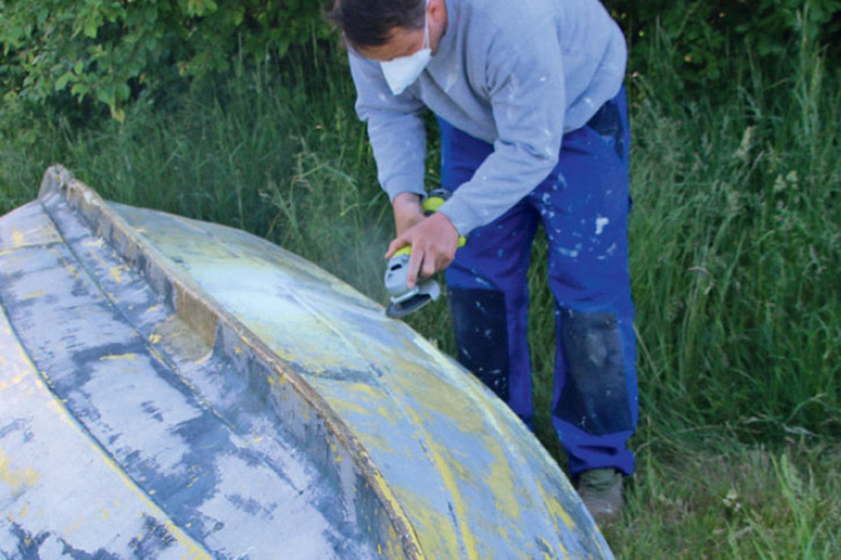 Når du skal reparere et hull i en båt, skal polyesteren og strimlene fra glassfibermatten hefte på den rå glassfiberen. Vi sliper derfor gammel bunnmaling, primer og det som ellers skjuler seg på skroget helt vekk av den gamle båten. Det kan virke litt voldsomt å bruke en vinkelsliper, men ta det helt med ro - ujevnheter og fordypninger blir utjevnet når den nye glassfiberen kommer på. Vi klipper glassfibermatten i små strimler og legger dem klare, før vi blander polyester og herder etter produsentens anvisninger.
