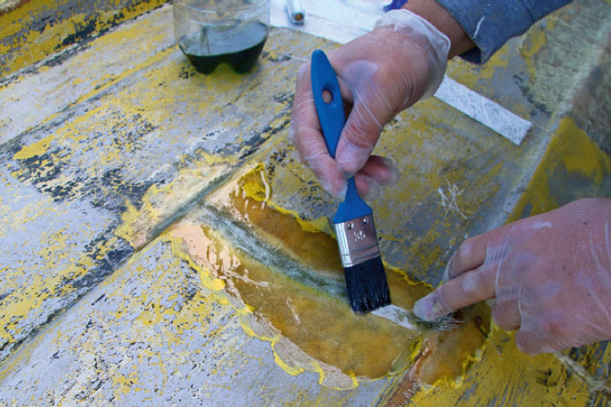For å lage overgangen mellom reparasjonen og skroget så flytende som mulig, bruker vi penselen til å “trekke” i glassfibertrådene, uten at selve mattene flytter seg.