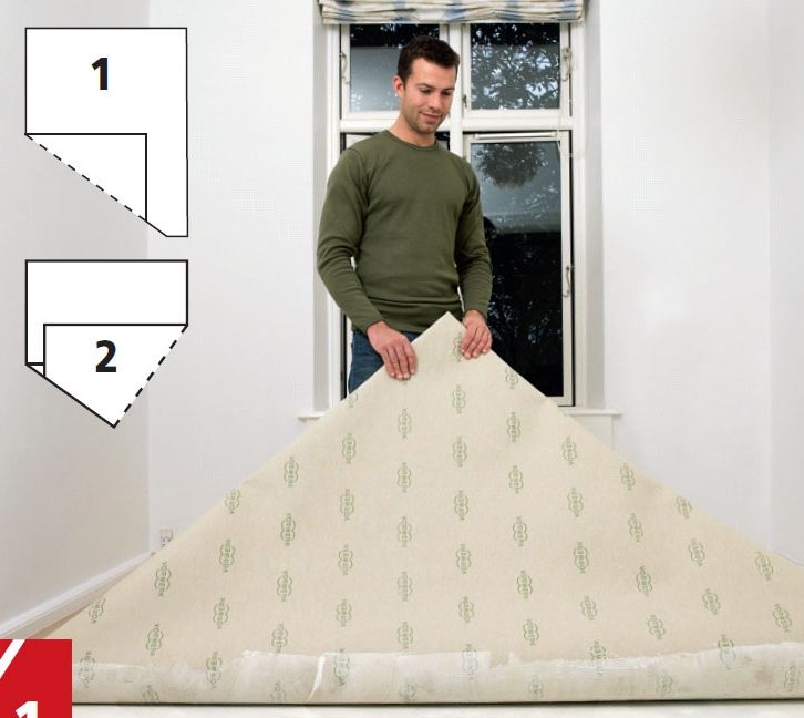 Trekk i ett hjørne om gangen, og brett på den måten halvparten av teppet til en konvolutt slik at du kan arbeide på den ene halv delen av gulvet.