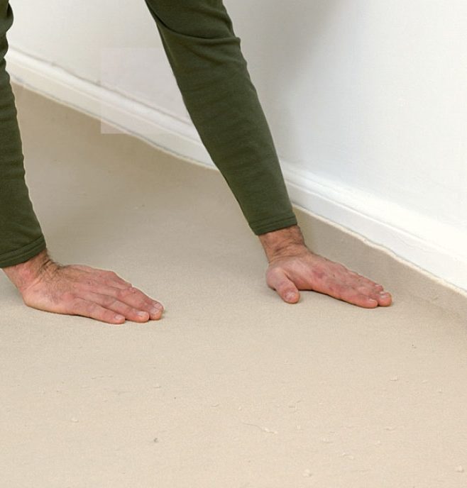 Begynn på midten, og rull teppet ut mot hjørnene. Press og stryk hele tiden i retning mot hjørnene, og glatt ut teppet på den måten. Pass på at du kommer helt ut på kantene.