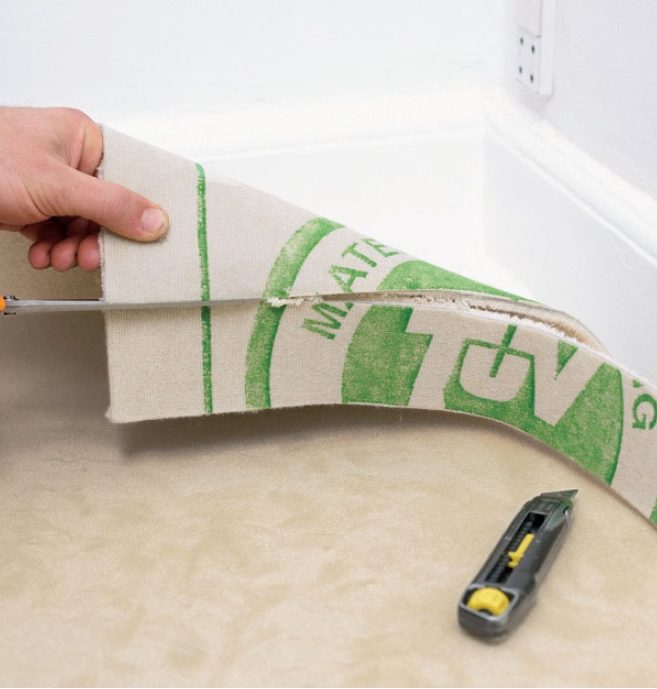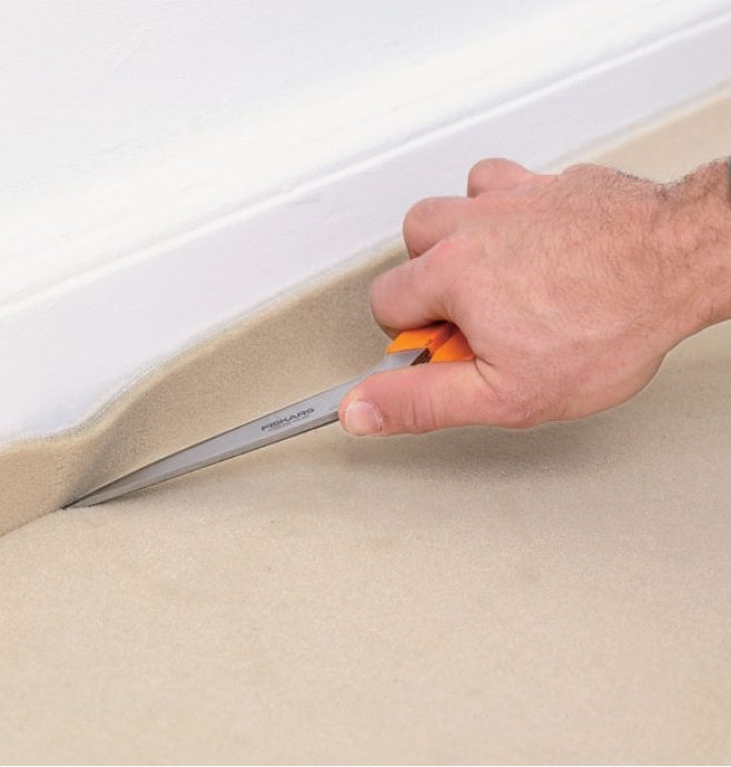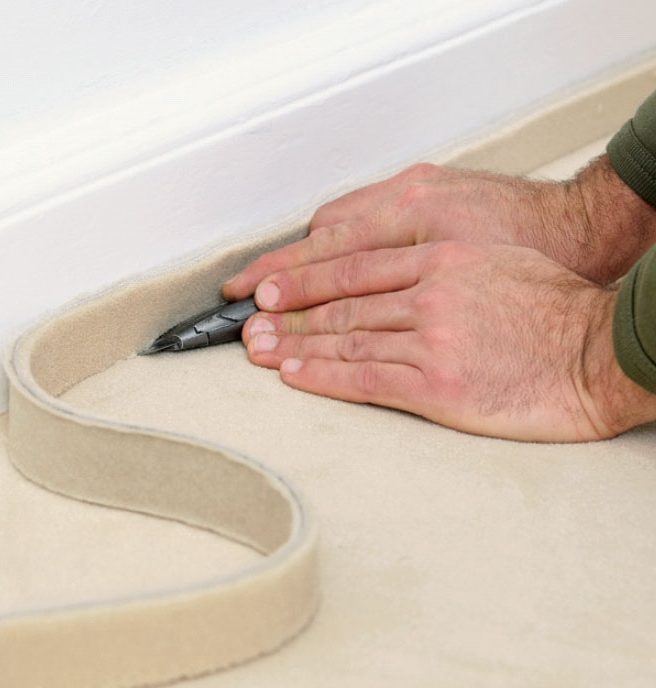Teppet er limt - nå skjærer vi til kantene