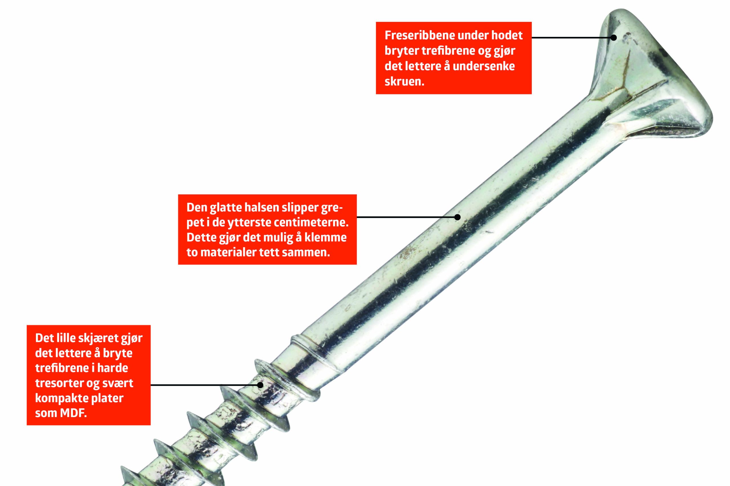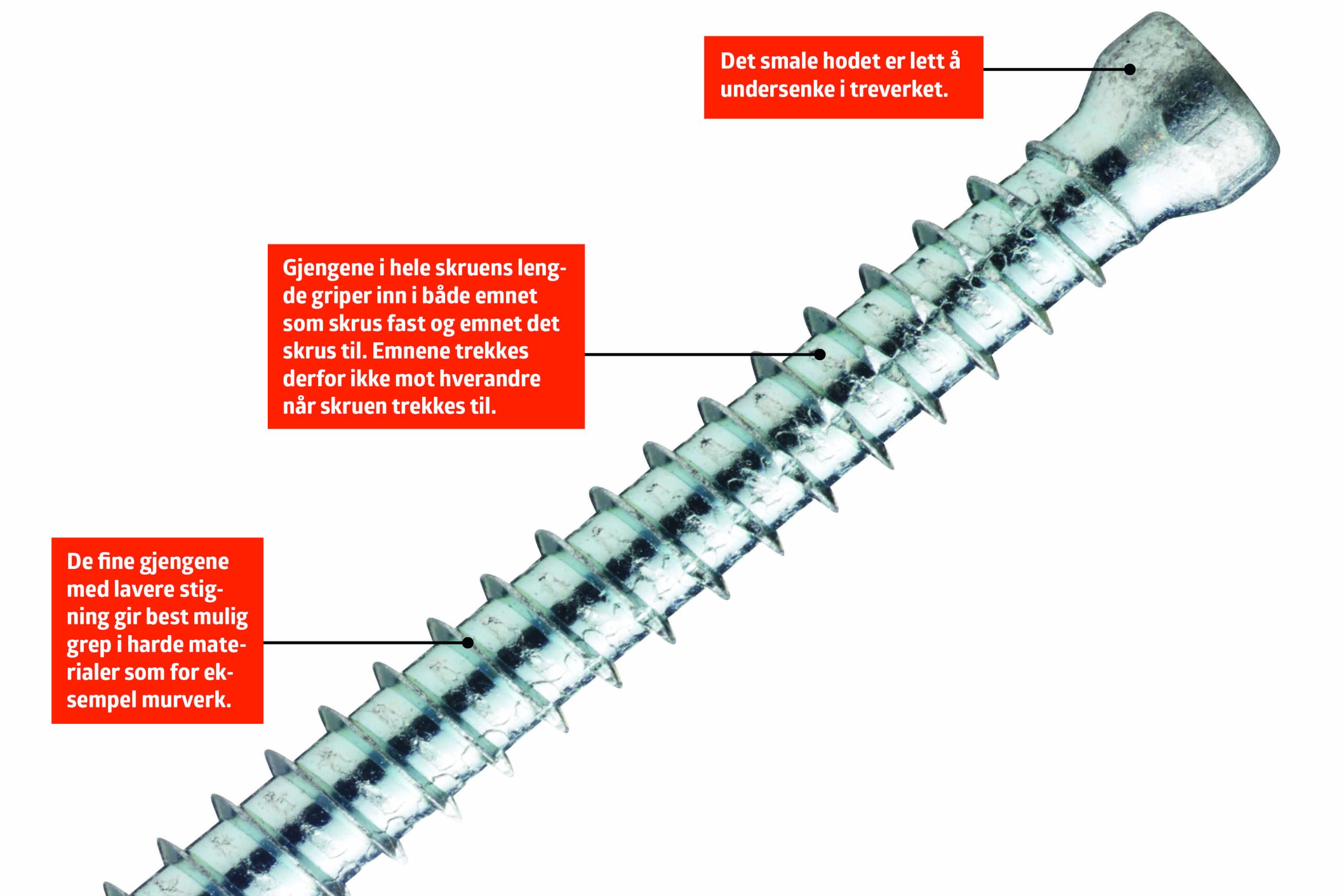 Skruen er smart og den desidert mest allsidige skruen i samlingen. Derfor har vi den alltid på lager i tre størrelser. Med dem klarer vi rundt 90 % av alle skrujobbene vi støter på i og rundt hjemmet. Det er oppgaven og dimensjonene på materialene vi skal skru i som avgjør hvilken av de tre størrelsene vi velger.
