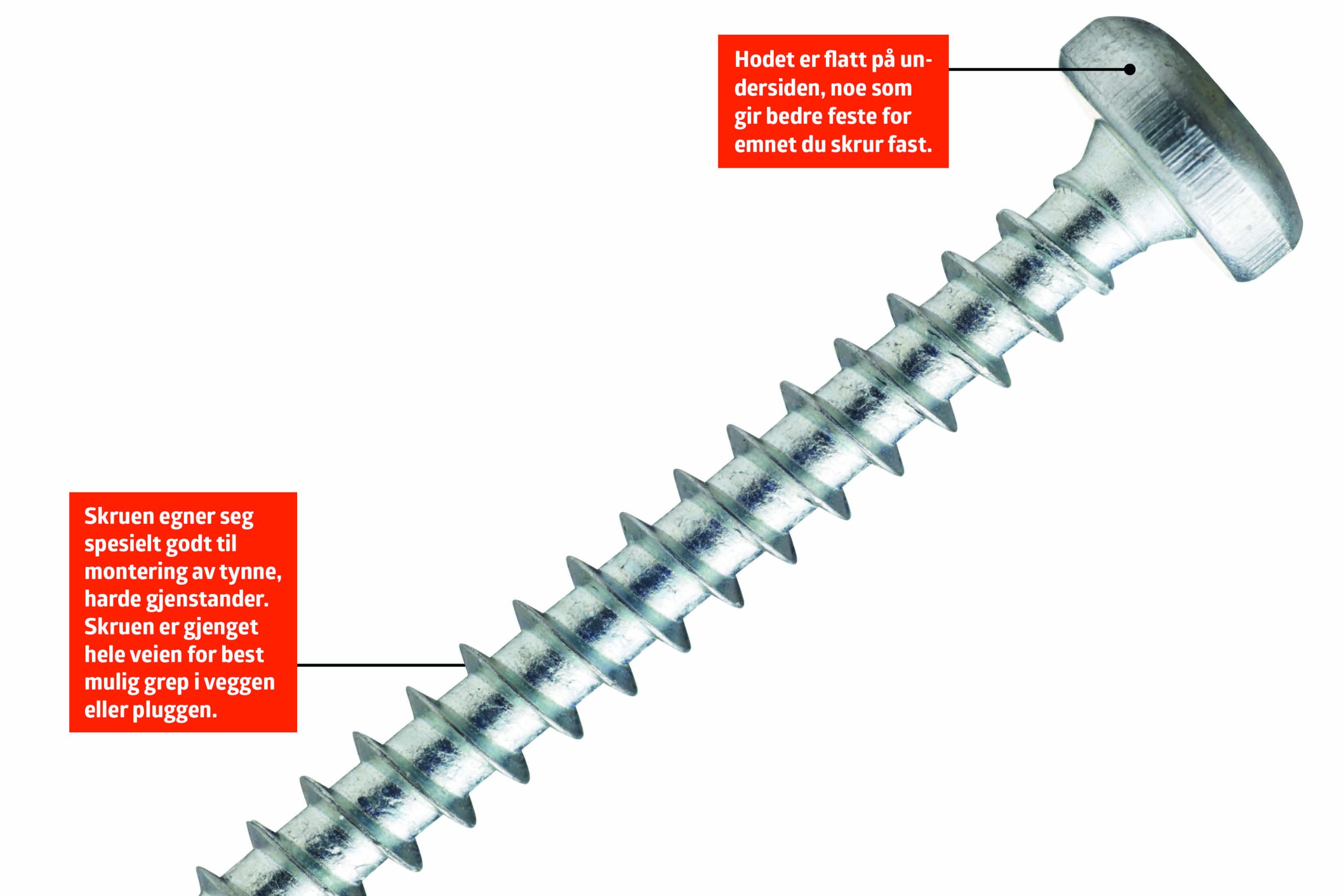 Skruen kan monteres direkte i betong, murstein og lettbetong uten plugg så lenge du forborer først, og den er smart til å montere lekter, veggsviller og annet direkte på murvegger.