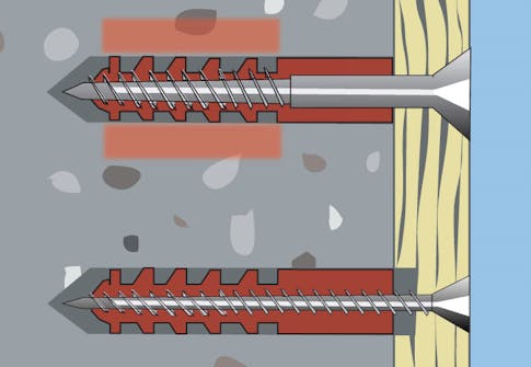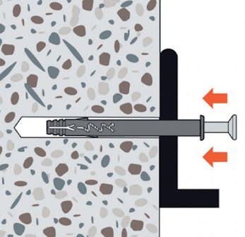 I BETONG er det ingen risiko for at muren sprekker. Der kan du bruke både nylonplugger, spikerplugger og ekspansjonsbolter. Hvis betongen er sprukket, anbefales limankere.