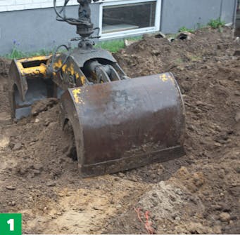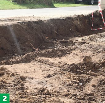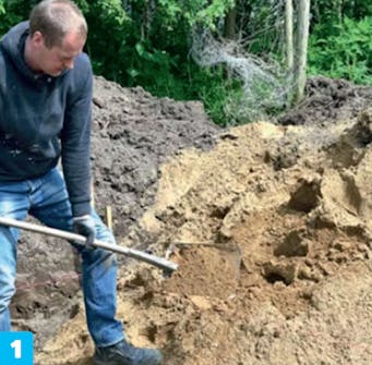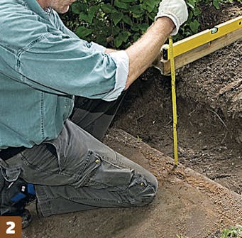Grav ned til riktig dybde, noenlunde plant. Du må gå ned 45-50 cm for å få plass til oppbyggingen av underlaget. Sørg for at underlaget har en helling på noen få prosent vekk fra huset.
