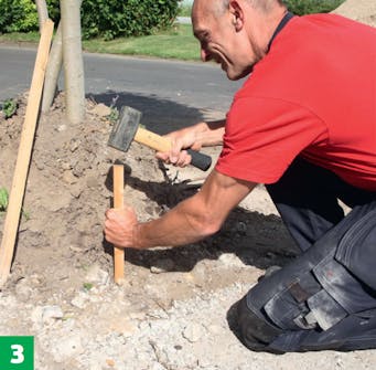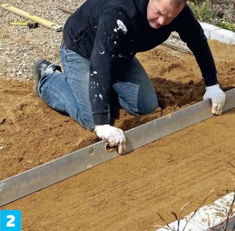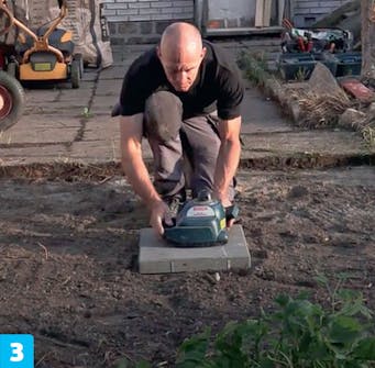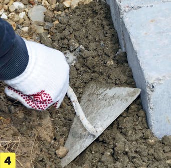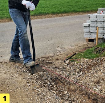 Grav ut renner til kantsteinene. Kantene skal plasseres i det samme forberedte underlaget som den øvrige belegningen. Derfor er det bærelaget du graver i.