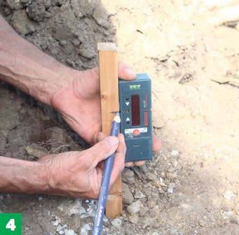 Avsett høyden på innkjørselen på pålene, slik at du får et måleplan. Her måler vi opp med en rotorlaser, som viser høyden på alle påler samtidig. I dagslys brukes en detektor for å kunne se laseren og markere punktet.