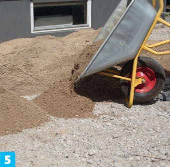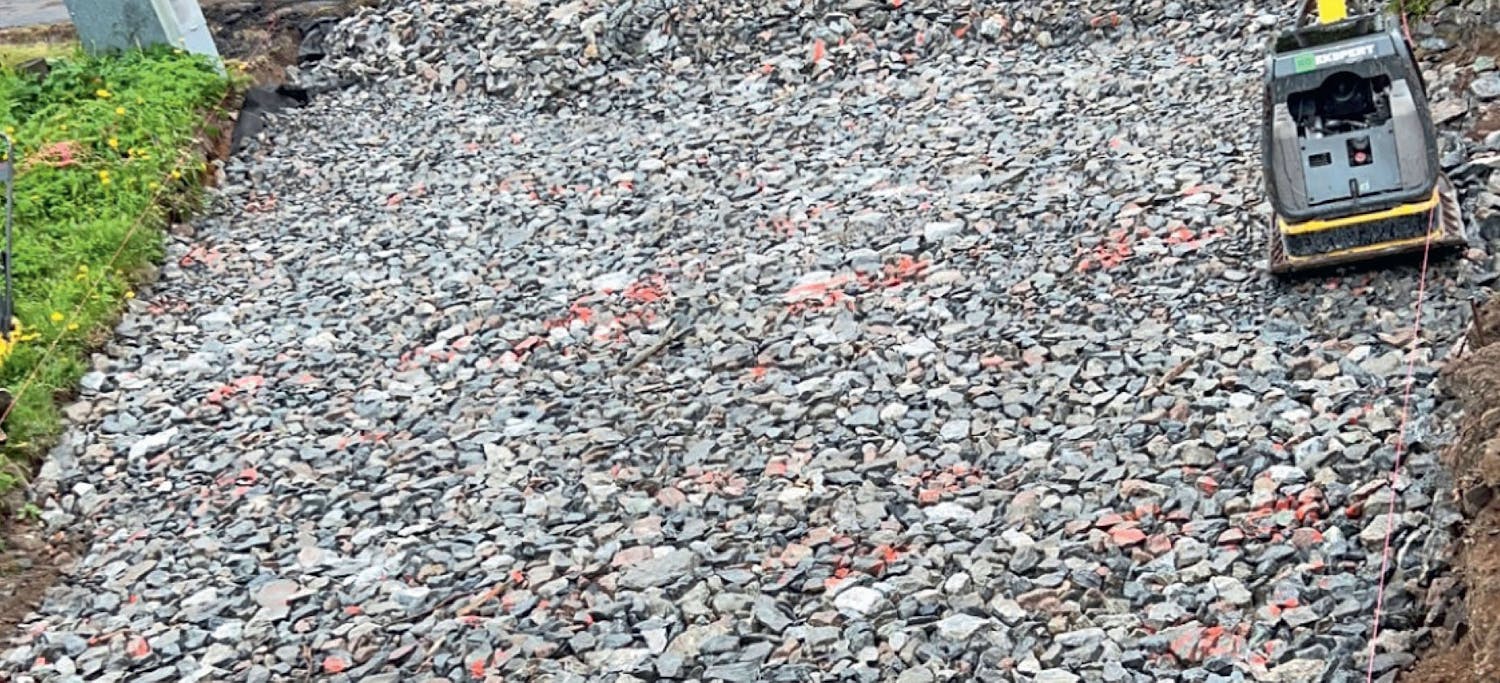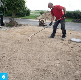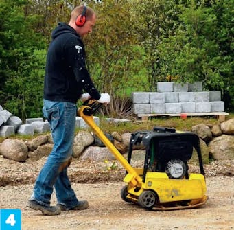 Bunnsikringen fordeles på råjorden. Vi legger 35 cm. Presisjon er ikke avgjørende - det kommer i bærelaget. Grusen stampes med en platevibrator og setter seg omkring 10 cm.