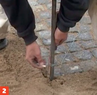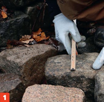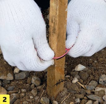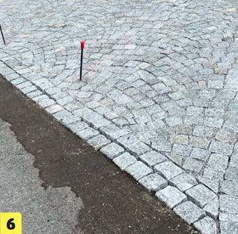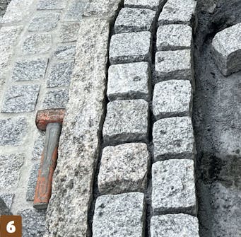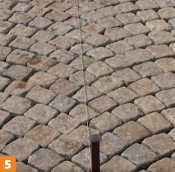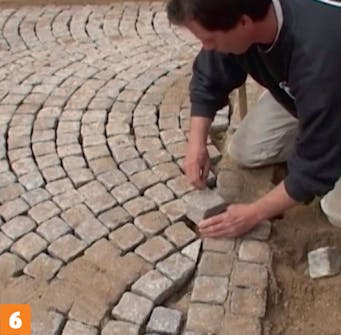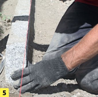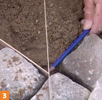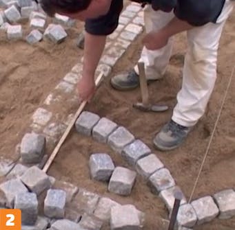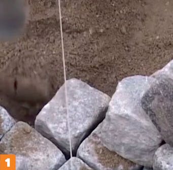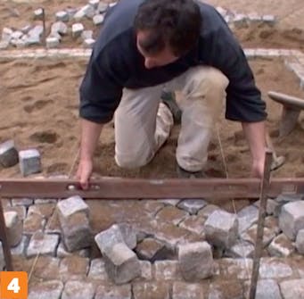 Marker overkanten av belegningen ved å trekke en snor. Bruk markeringene til å starte settingen av brostein. Når første rekke er satt etter snoren, kan steinene deretter settes slik at de flukter.