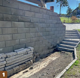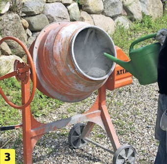 Bland jordfuktig betong. Bruk gjerne en blandemaskin. Det er viktig at betongen er så stiv at kantsteinene kan settes ned i den uten at den flyter ut.