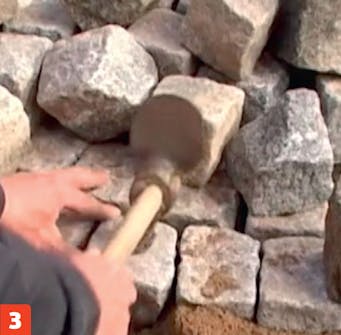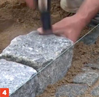 Det øverste settelaget blir nemlig fortløpende løsnet, samtidig som du setter brosteinen ned i grusen og slår den noen centimeter ned. Steinen settes dermed solid i grusen, som også blir presset opp langs sidene når du slår den ned med hammeren.