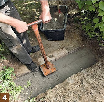 Legg et 10 cm tykt lag betong. Bredden skal være stor nok til at du kan avstive sidene. Det gjør du med betong som går 10 cm ut i siden og minimum 5 cm opp på kantsteinen, slik at den ikke kan skli ut.