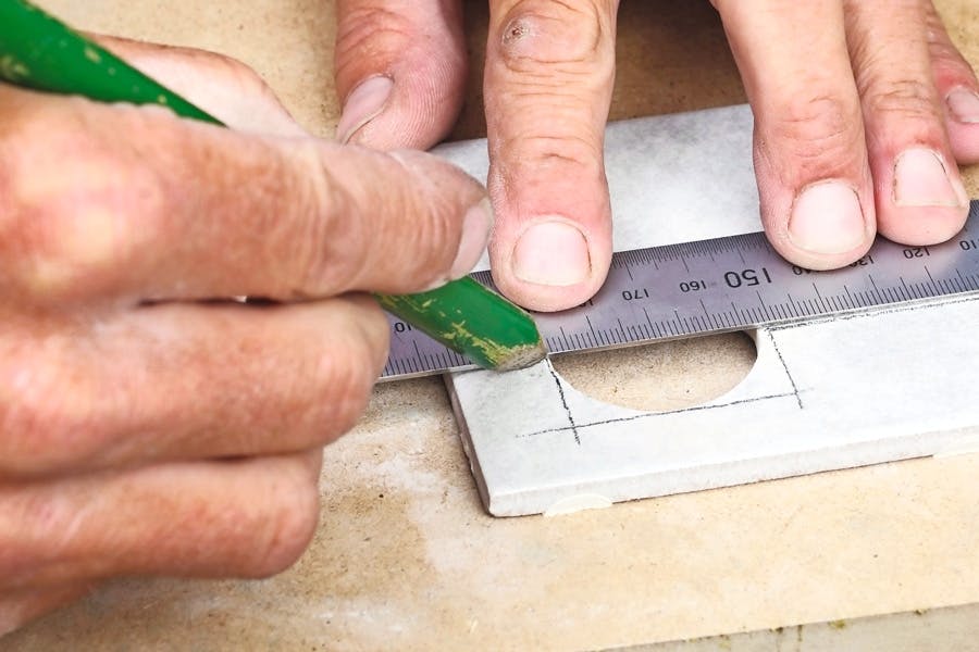 Strek opp på flisen akkurat midt i hullet. Delingen av flisen bør følge rørets retning, altså loddrett eller vannrett. Det gir det mest harmoniske resultatet.