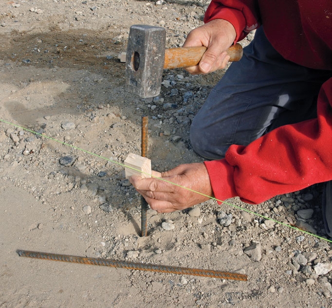 Spenn ut en snor for å markere hellekanten i den ene siden. Bank plugger av kamstål (F) ned i bakken. Hold en bit av et forskalingsbord (C) mot snoren for å sikre samme avstand hele veien. Pass på å unngå en buet forskaling.