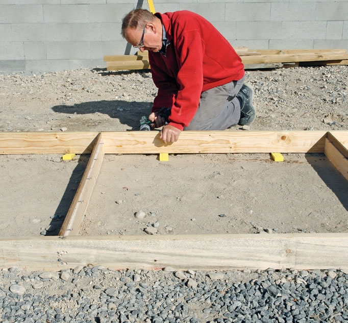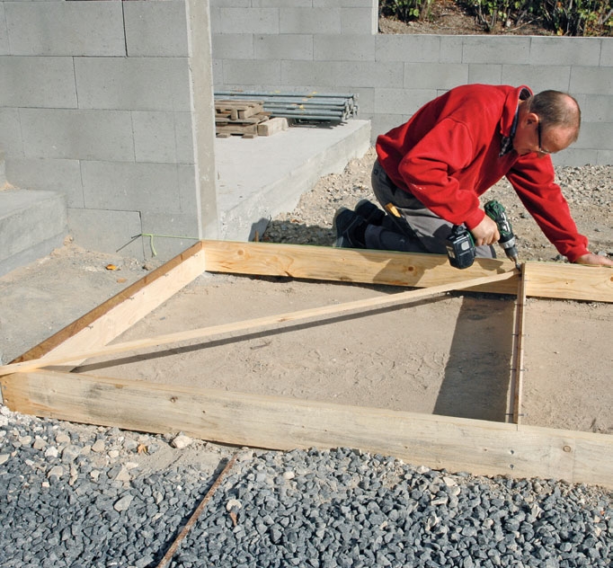 Finn en list som kan rekke diagonalt over hellen. Skru den fast i to motstående hjørner, slik at formen fikseres i helt rett vinkel.