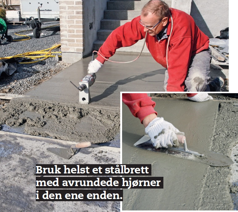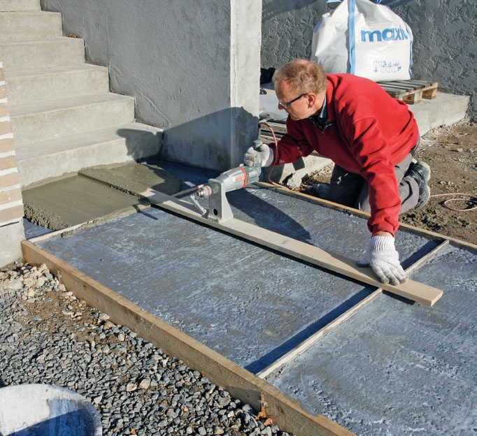 Før bjelkevibratoren i et jevnt tempo over formen. Fyll opp hull, og gjenta prosessen til overflaten er jevn. Straks jevnes overflaten med et stålbrett.