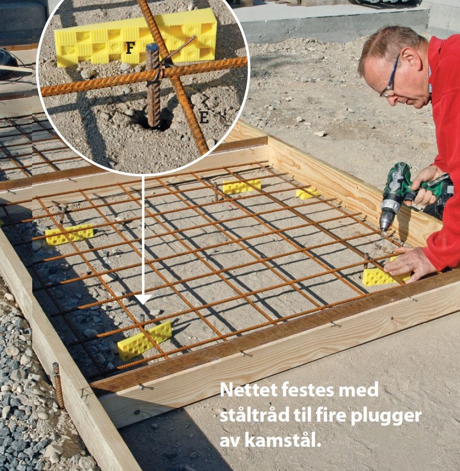 Armeringsnettet skjæres til med en vinkelsliper med skjæreskive og legges i formen. Kloss opp nettet til midt grovbetongen, og slå fire plugger av kamstål (F) i ved nettets “krysspunkter”. Nettet festes til pluggene med ståltråd eller plastikkstrips.