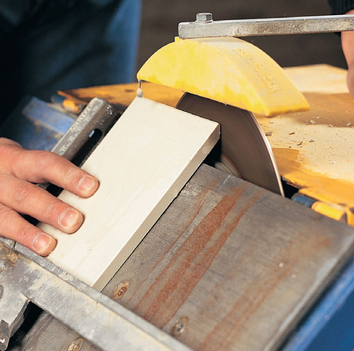 Fliser som møtes i et utvendig hjørne, skal skråskjæres på baksiden, slik at fugen ikke blir altfor bred. Det kan gjøres med en slipeskive på vinkelsliperen.