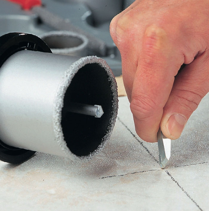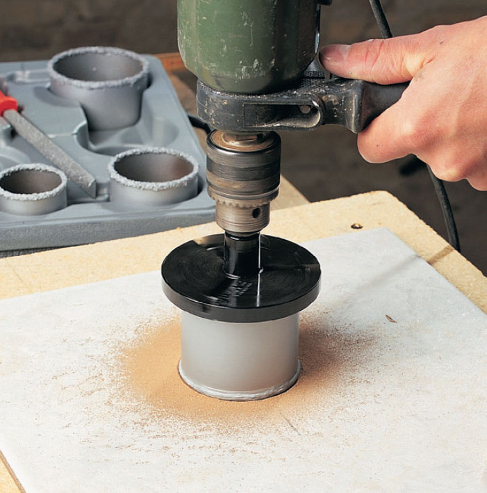 Plasser koppborets senterbor i sentrum, og bor på lav hastighet. Spenn flisen godt fast til arbeidsbordet, og bor deg hele veien gjennom.