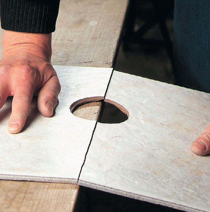 Hvis flisen skal rundt et rør, må den deles. Det gjøres først etter at hullet er boret (du kan ikke bore halve hull). Riss opp med fliskutteren der flisen skal deles, og knekk den over en bordkant.