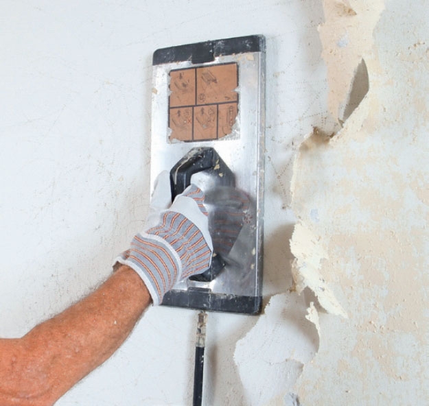 Skrap av tapetet med en bred sparkel. Slip kanten på sparkelen skarp. Da blir den utmerket til å skrape tapet med. Du kan eventuelt holde tapetfjerneren i den andre hånden, mens du skraper av.