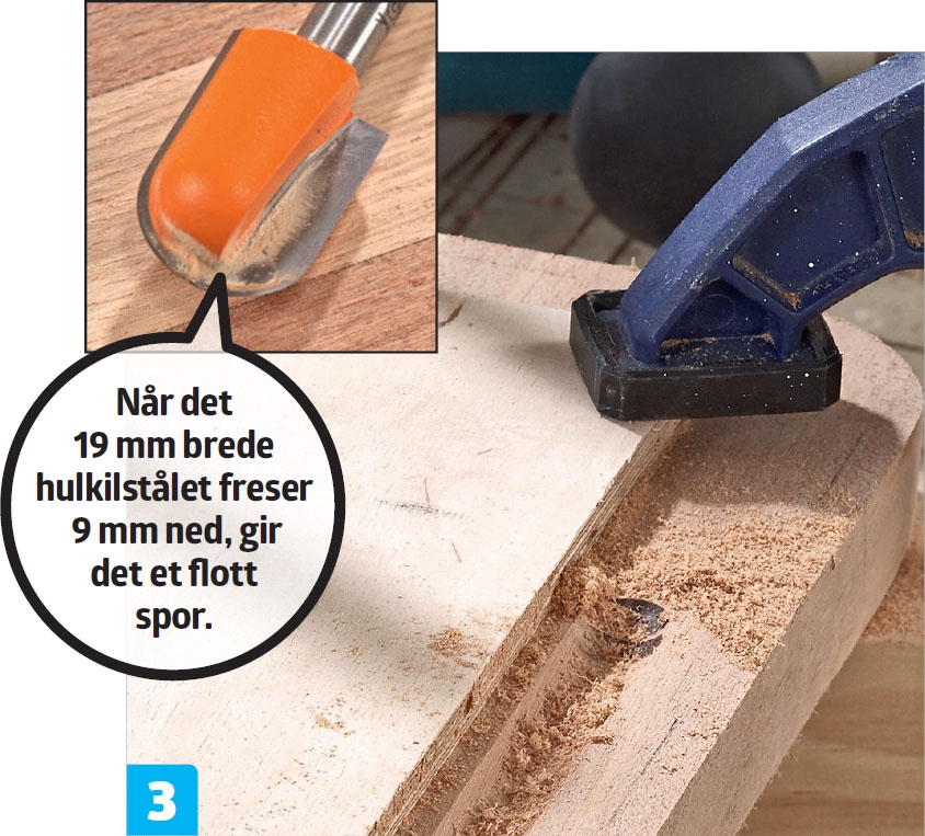 Saftsporet freses med et 19 mm hul-kilfresestål. Plasser fresemalen til sporet nøyaktig sentrert, og spenn den forsvarlig fast. Fres saftsporet i flere omganger med økt fresedybde, til sporet er 9 mm dypt.